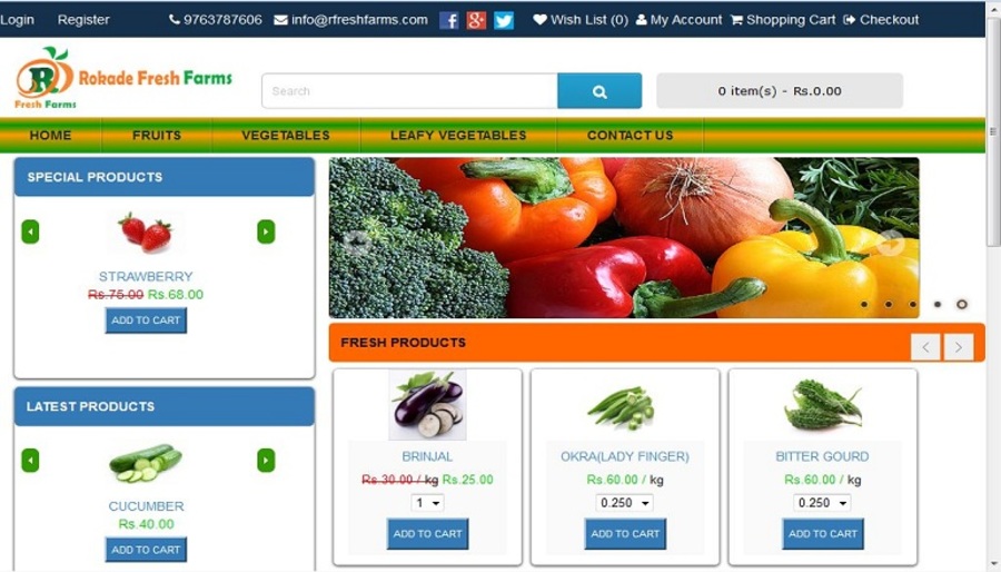 This is screenshot of our ecommerce homepage. Rokade Fresh Farms is the retail online store of Fresh Fruits and Vegetables.Rokade Fresh Farms is situated in Pune, India with its packing and delivery facilities in Pune area.It has been started with the passion of the promoters towards farming and then with a thought of bridging the gap between the Farmers and the Consumers.
